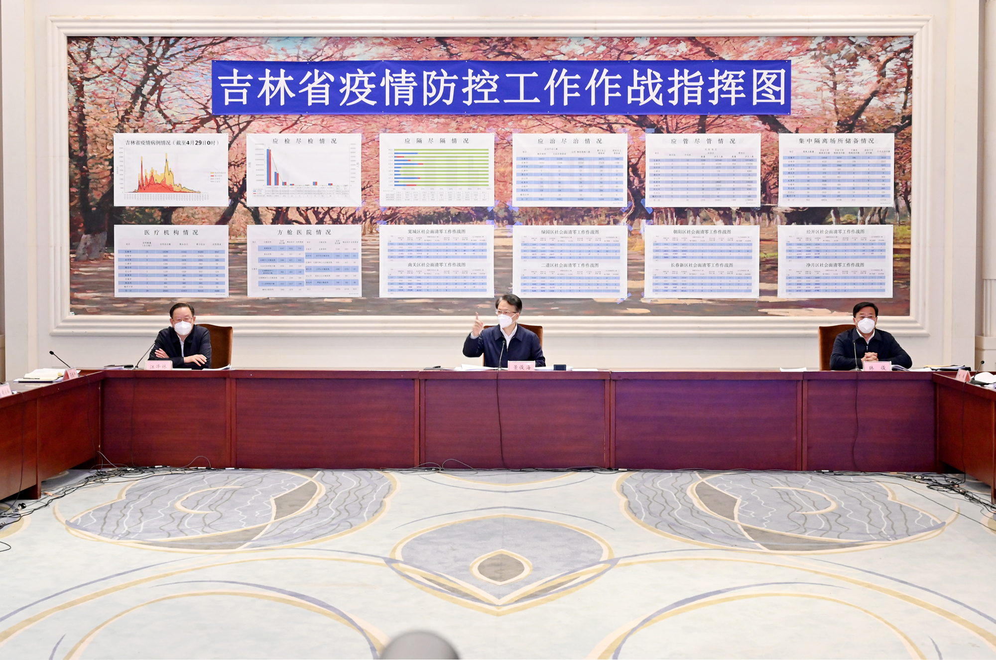 4月29日,吉林省委书记景俊海以视频形式主持召开省疫情防控领导小组会议,审议通过《吉林省创建无疫单位和无疫县(市、区)工作方案》。景俊海强调,要深入贯彻习近平总书记关于高效统筹疫情防控和经济社会发展的重要讲话重要指示精神,按照孙春兰副总理部署要求,坚持科学精准、动态清零,大力推广无疫小区创建成功探索,扎实推进无疫村屯、无疫社区、无疫校园、无疫企业建设,延伸创建无疫城市,不断巩固拓展疫情防控成果。省委副书记、省长韩俊,省政协主席江泽林出席会议。